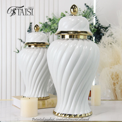 J294GA Pot de gingembre à grain ondulé blanc et or textures céramiques vases pour fleurs accents de décoration intérieure meubles de luxe