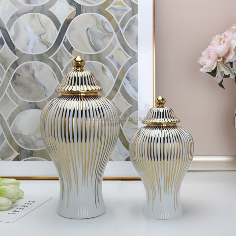 J286GA, jarrón de cerámica de línea cruzada blanca y dorada, Decoración de mesa de lujo dorada, tarro de jengibre texturizado para decoración del hogar